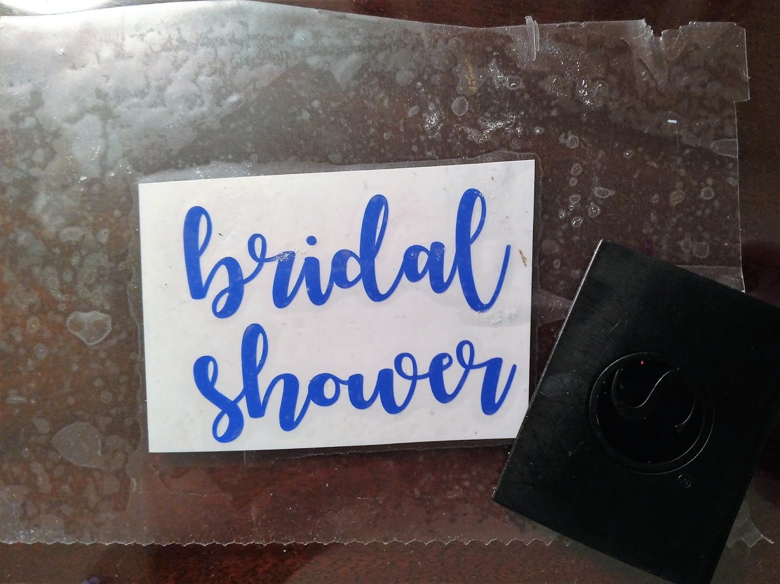 4. Take a piece of your contact paper and press it on top of the vinyl. I like to reuse my contact paper for a while - the decreased stickiness is actually very helpful. You want the contact paper to grab the vinyl, but not bond to it. Take your scraper tool and slowly press down on top of the entire design ensuring that the contact paper has stuck to the vinyl.